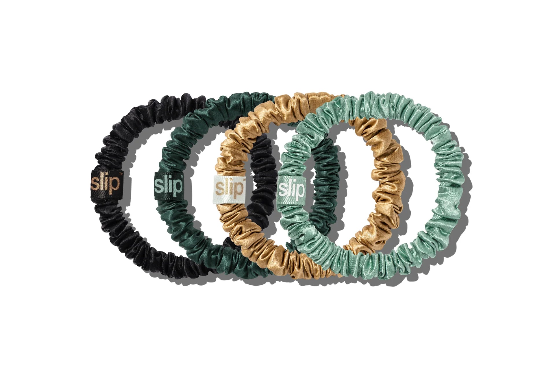 This set includes: 1 x black, 1 x evergreen, 1 x gold, 1 x pistachio pure silk skinny scrunchies